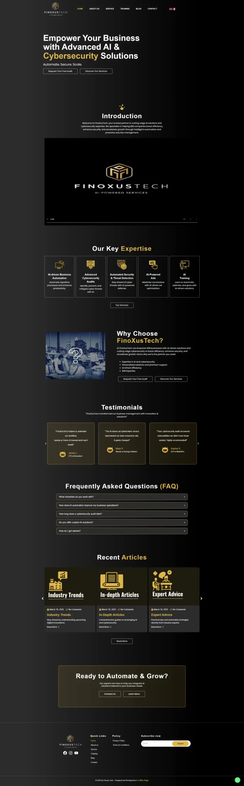 Finoxustech wanted a simple, easy-to-manage website that clearly showcases their AI and cybersecurity services, with the added need for multi-language support to reach a broader audience. We developed a clean, multi-page website focused on simplicity and ease of use. The design ensures visitors can quickly find the information they need, while the client can effortlessly update content. To support their diverse audience, we integrated multi-language functionality, allowing the website to be easily switched between different languages. The project was completed within 20 days, delivering a fully responsive, user-friendly site that works seamlessly on all devices. The content management system was set up to let the client manage all languages smoothly without technical difficulties. The client was very happy with the result—a professional, functional, and multilingual website that helps them connect with a wider audience and maintain their digital presence with ease.